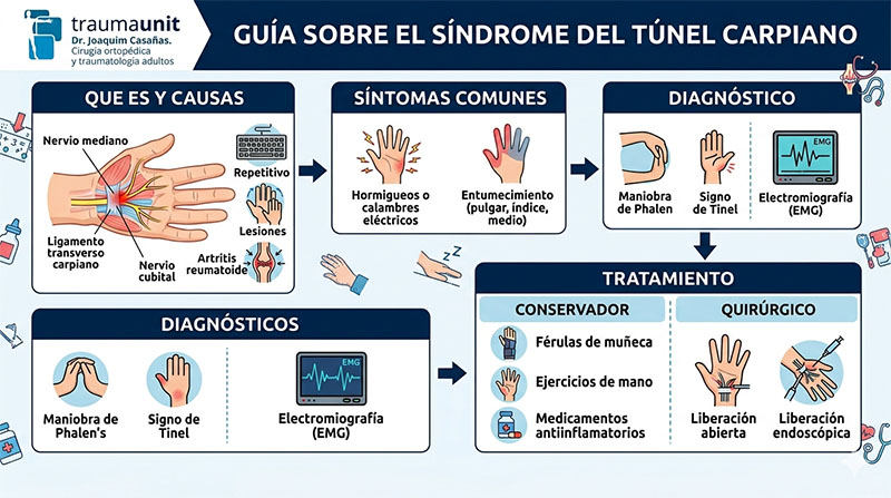 El síndrome del túnel carpiano es una afección neurológica común que afecta la muñeca y la mano. Se produce por la compresión del nervio mediano y puede llevar a diversos síntomas que afectan la calidad de vida. En este artículo, el doctor Pau Lopez-Osornio, integrante del equipo médico de TRAUMAUNIT en Clínica Teknon en Barcelona, aborda las causas, síntomas, opciones de tratamiento conservadoras y quirúrgicas relacionadas con el síndrome del túnel carpiano.